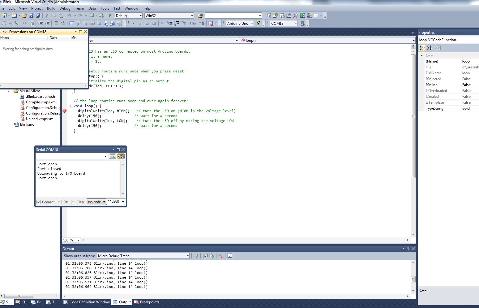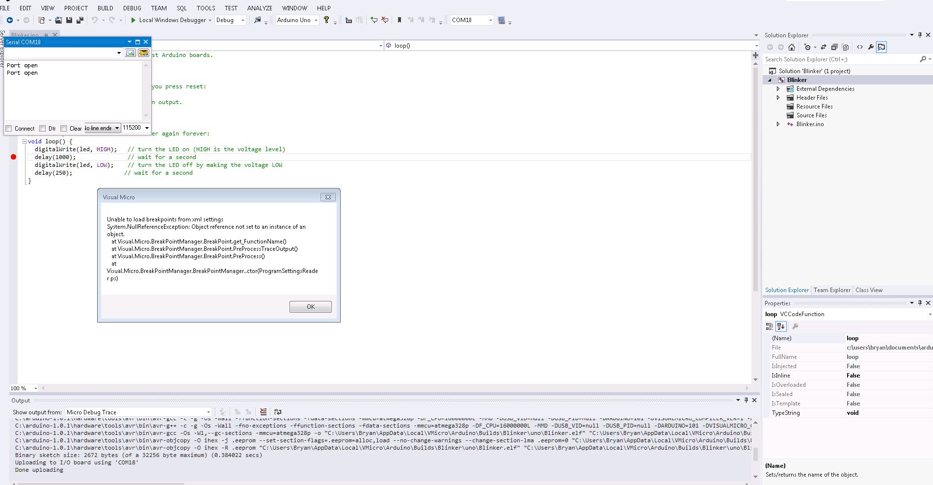 As you can see here is the simple Arduino Blink example being debugged, it compiled fully and uploaded to my UNO using Visual Studio and the plugin.
